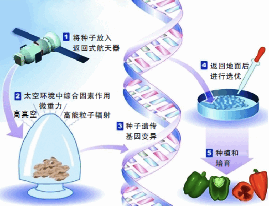 「太空種子」又稱作「衛星育種」,或「空間誘變育種」,它不是轉變基因,因爲過程中沒有人為將外源基因導入到種子中。太空育種是指太空船將地球植物的種子送上太空,放於特定空間,在高真空、宇宙高能粒子輻射、宇宙磁場、高潔淨(即無污染)、微重力等狀態下,產生誘變作用。在誘變過程中,植物種子的 DNA被雙鏈擊穿,產生斷裂並重新排序,而地面的誘變技術卻只能讓 DNA被單鏈擊穿,科學家之後再將這些種子送回地球,進行挑選與特別栽種後,大約4-6年,經過4代的選育,才成功培育出新品種的「太空種子」,所以我們並不需要擔心它們曾接受輻射,因爲到我們手上時已年代久遠。以水稻為例,它的自然變異率在二十萬分之一左右,化學誘變的變異率是千分之幾,但經過空間(太空環境)誘變的水稻變異率,卻可達百分之幾。太空育種本質上與自然界的變異相同,但是太空育種加快了變異的過程,提高了變異的概率,可以理解成為加速自然變異。